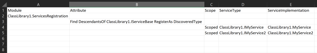 Here’s another example that doesn’t require a marker interface like IScopedService. This example registers by the convention that any class implementing an interface with a name ending Repository should be registered as Scoped.